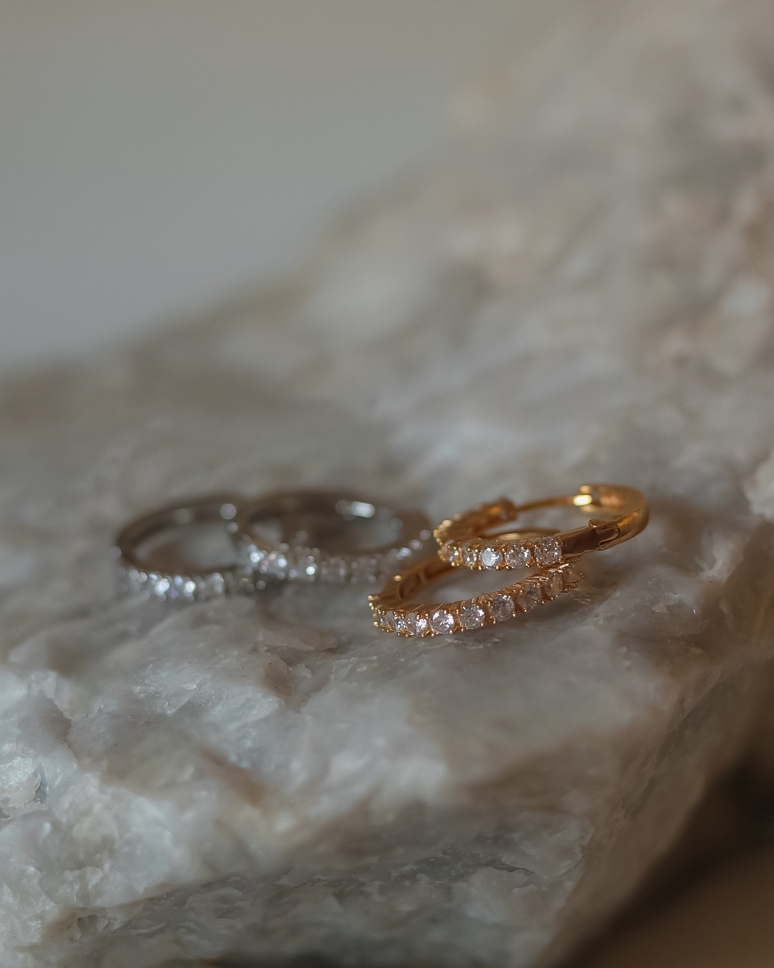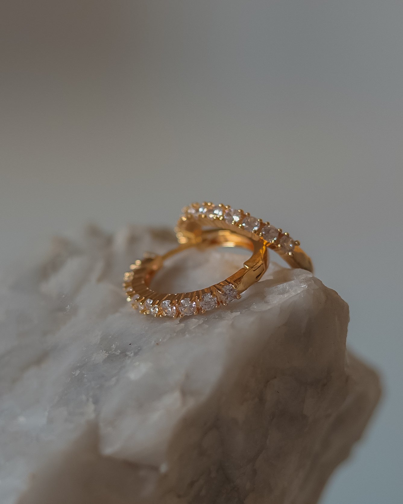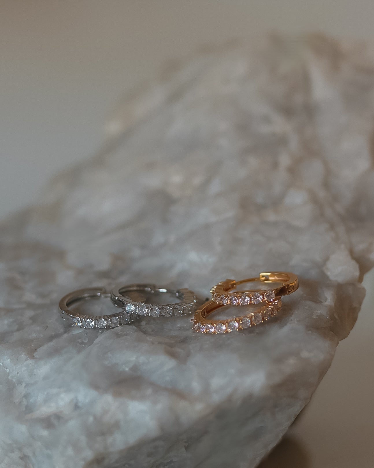 Os Brincos Aura Arc são argolas huggie cravejadas com zircónias em estilo pavê, oferecendo brilho delicado e sofisticação discreta. Versáteis, podem ser usados sozinhos ou em combinações de piercings, disponíveis em Prateado e Dourado, e feitos para durar mantendo o brilho.