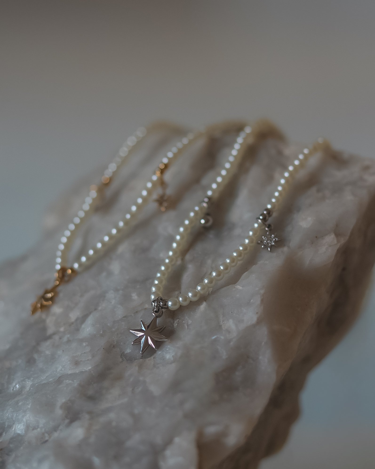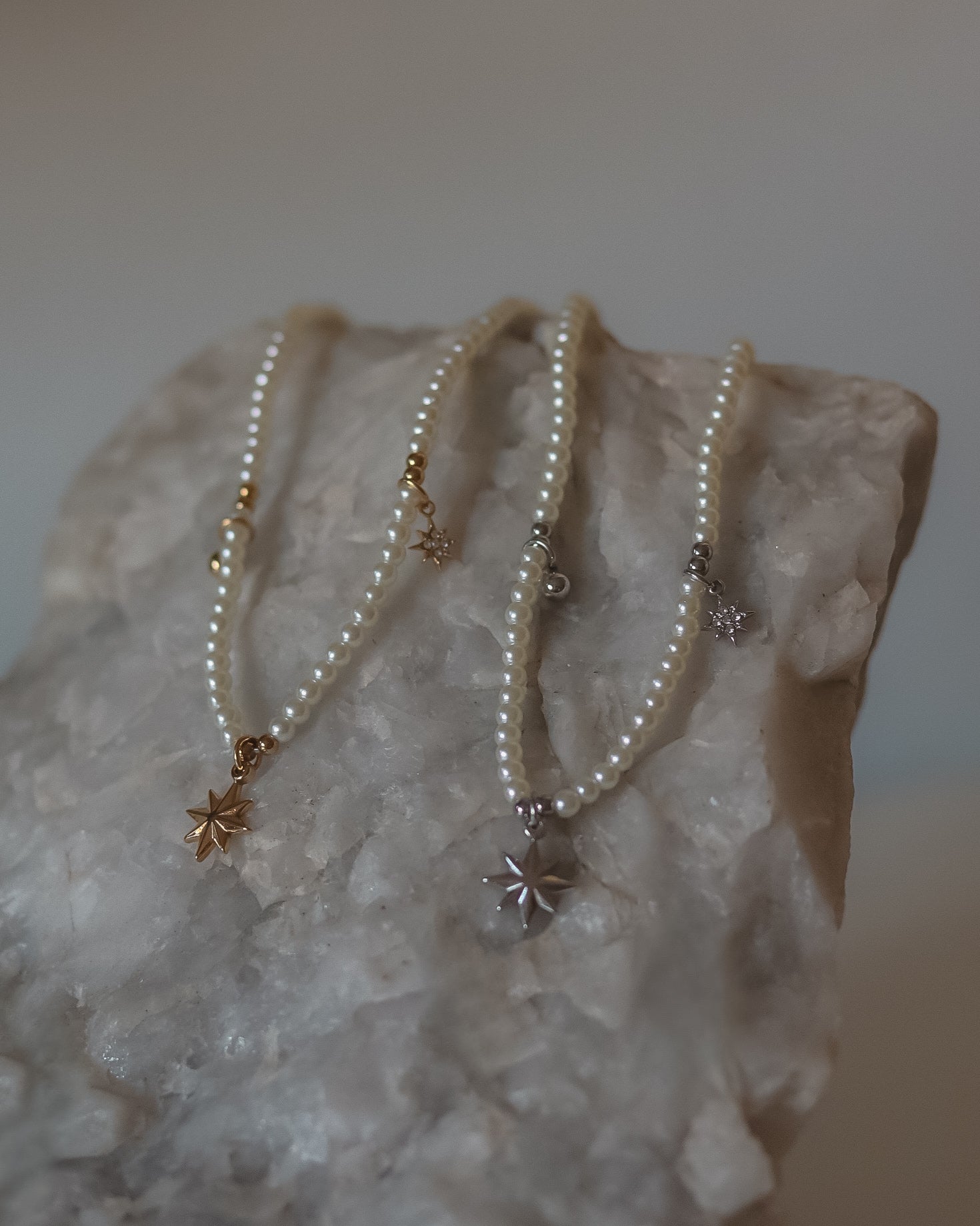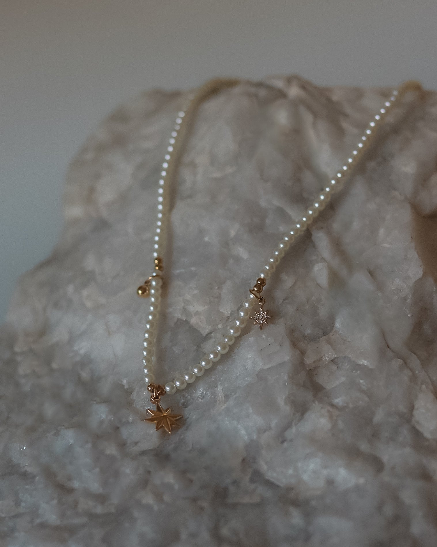 O Colar Nova combina corrente de pérolas com um charm em forma de estrela, simbolizando luz e orientação. Feito em aço inoxidável, disponível em Dourado e Prateado, é ideal para sobreposições ou para adicionar um toque delicado e moderno ao look.